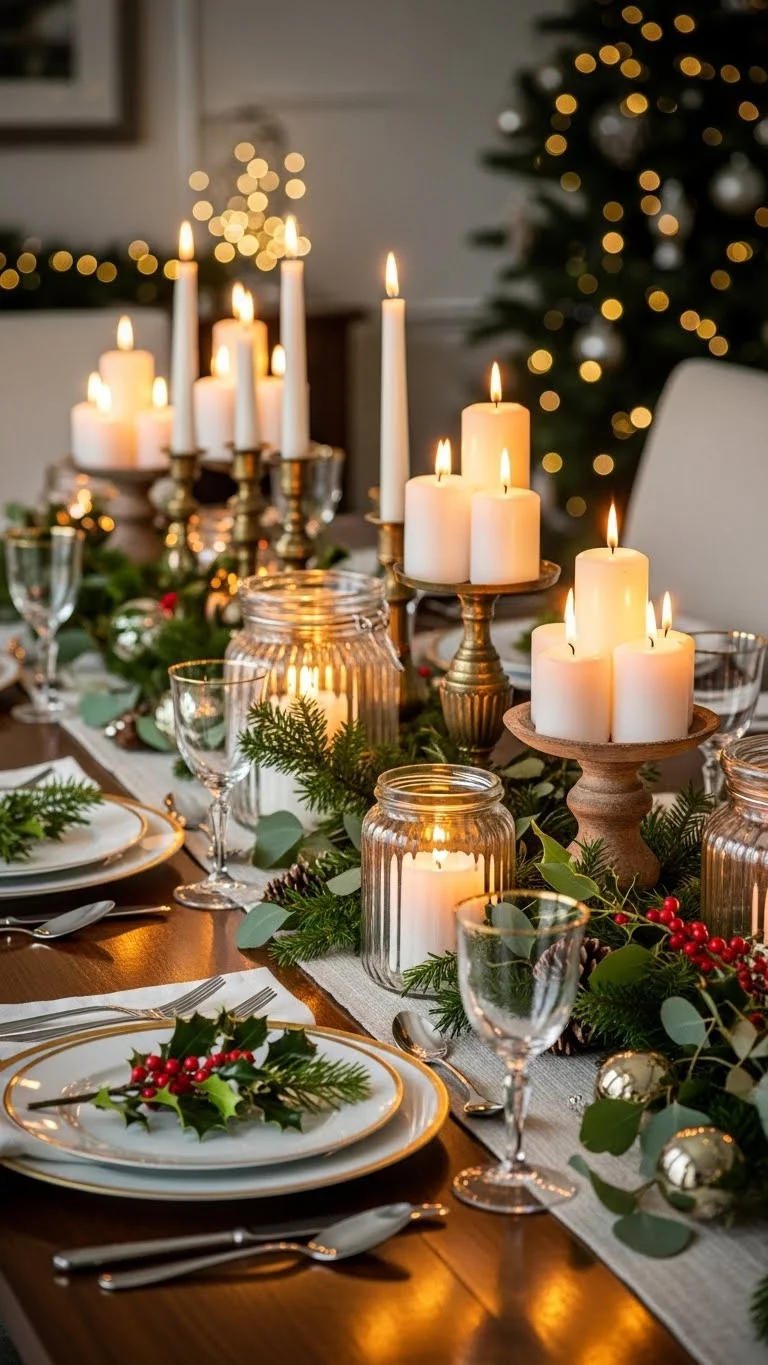 Candles change everything. They soften the room fast. Use different heights to keep the table lively. Tall tapers work well with short pillars. Add tea lights for balance. You do not need matching holders. Mix glass jars, thrifted brass, and simple ceramic pieces. Stick to one candle color. White or cream keeps it calm. Battery candles work well for homes with kids or pets. They still give that gentle glow. Place candles in small groups. Three to five per cluster feels natural. Leave space for plates and serving dishes. Keep flames away from greenery. For a low-cost option, reuse empty jars. Clean them well. Wrap twine or ribbon near the base. Drop in tea lights. It looks thoughtful without effort. If wax drips worry you, use dripless tapers. They cost a little more but save cleanup time. Candle clusters work on long tables and small ones. You can scale up or down easily. They pair well with almost any style. Rustic, modern, or classic all work. This idea fits busy hosts. You can set it up in minutes and still get a warm result.