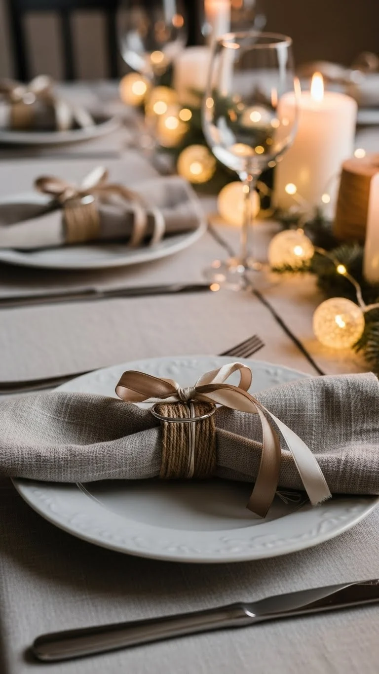 Linen napkins add texture right away. You do not need fancy folds. A loose knot looks relaxed and thoughtful. Stick to soft colors. Cream, beige, muted green, or gray work well. Bold prints can distract from the rest of the table. If you do not own linen napkins, check secondhand shops. Many sets appear during holiday seasons. Cotton works fine, too. Wash and dry them ahead of time. Skip ironing for a casual look. Wrinkles add charm. Tie each napkin the same way. Consistency keeps the table calm. Place them on plates or slightly off to the side. Add a small sprig of greenery through the knot. Rosemary or pine works well. It smells good and costs little. Ribbon works too. Use twine or leftover gift wrap ribbon. Avoid shiny bows. Simple ties look better here. This idea takes little time. You can prep napkins the night before. Guests notice cloth napkins. They feel cared for without feeling formal. It is a small change that makes a big visual impact.