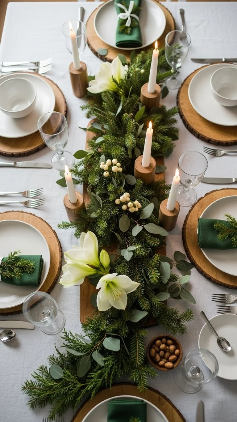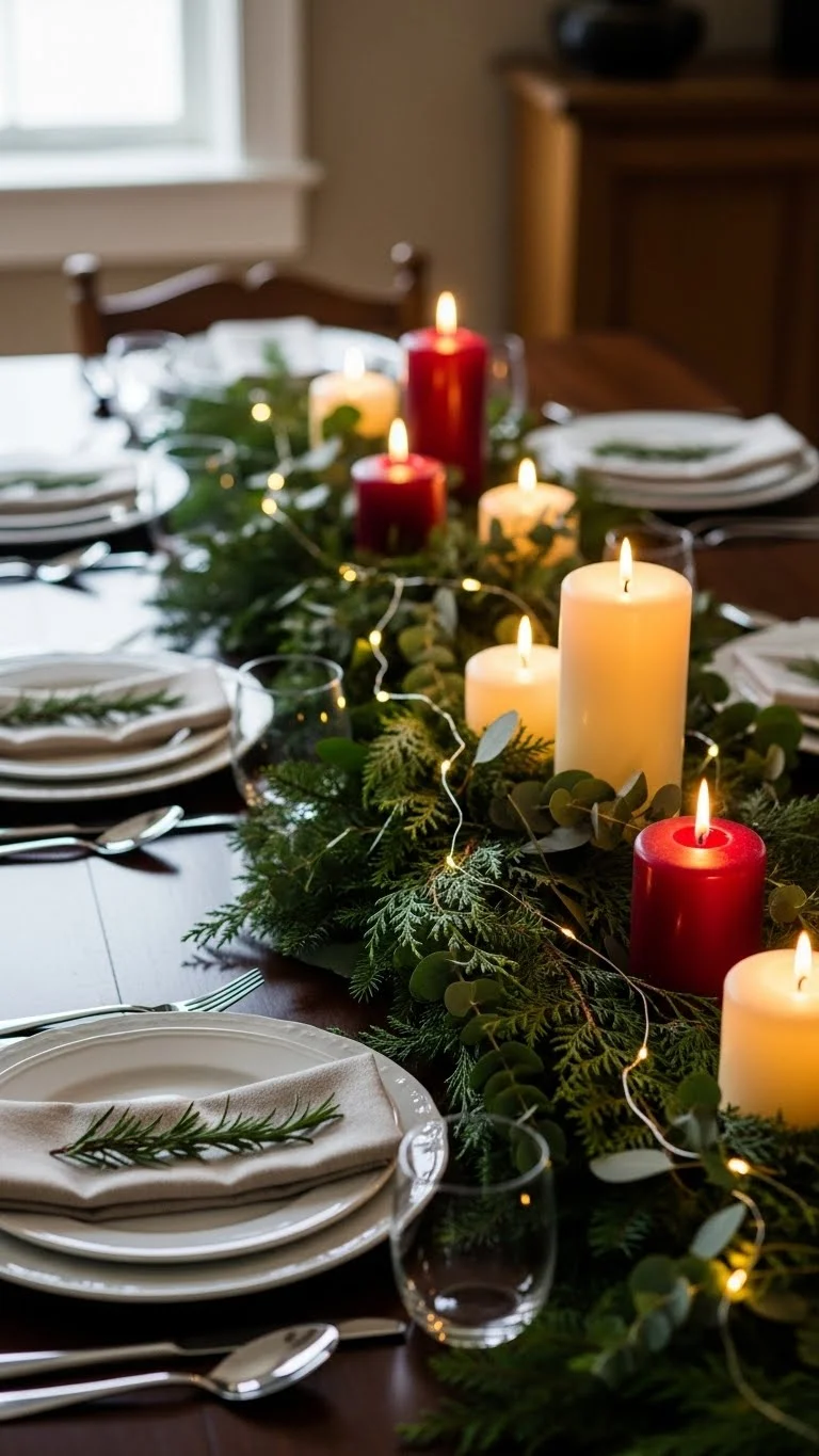 A greenery runner brings the outdoors inside. It feels calm and seasonal. You can use pine, cedar, or eucalyptus. Real or faux, both work. Lay the greenery straight down the center. Keep it loose. Avoid perfect lines. Let branches overlap a bit. If real greenery is hard to find, check grocery stores. Many sell affordable bundles. Faux greenery lasts year after year and stores easily. Tuck candles into the runner. Keep them spaced out. Add small pinecones for texture. Skip heavy decorations that crowd the table. No runner cloth needed. The greenery becomes the runner. This saves money and keeps the table relaxed. For easy cleanup, place parchment paper under real greenery. It catches needles and sap. Guests will not see it. If your table is short, use sections instead of one long piece. It still looks intentional. This style works well with simple plates and neutral linens. It lets food stay the focus while adding warmth. Greenery runners feel welcoming without extra effort. They suit casual dinners and larger holiday meals.