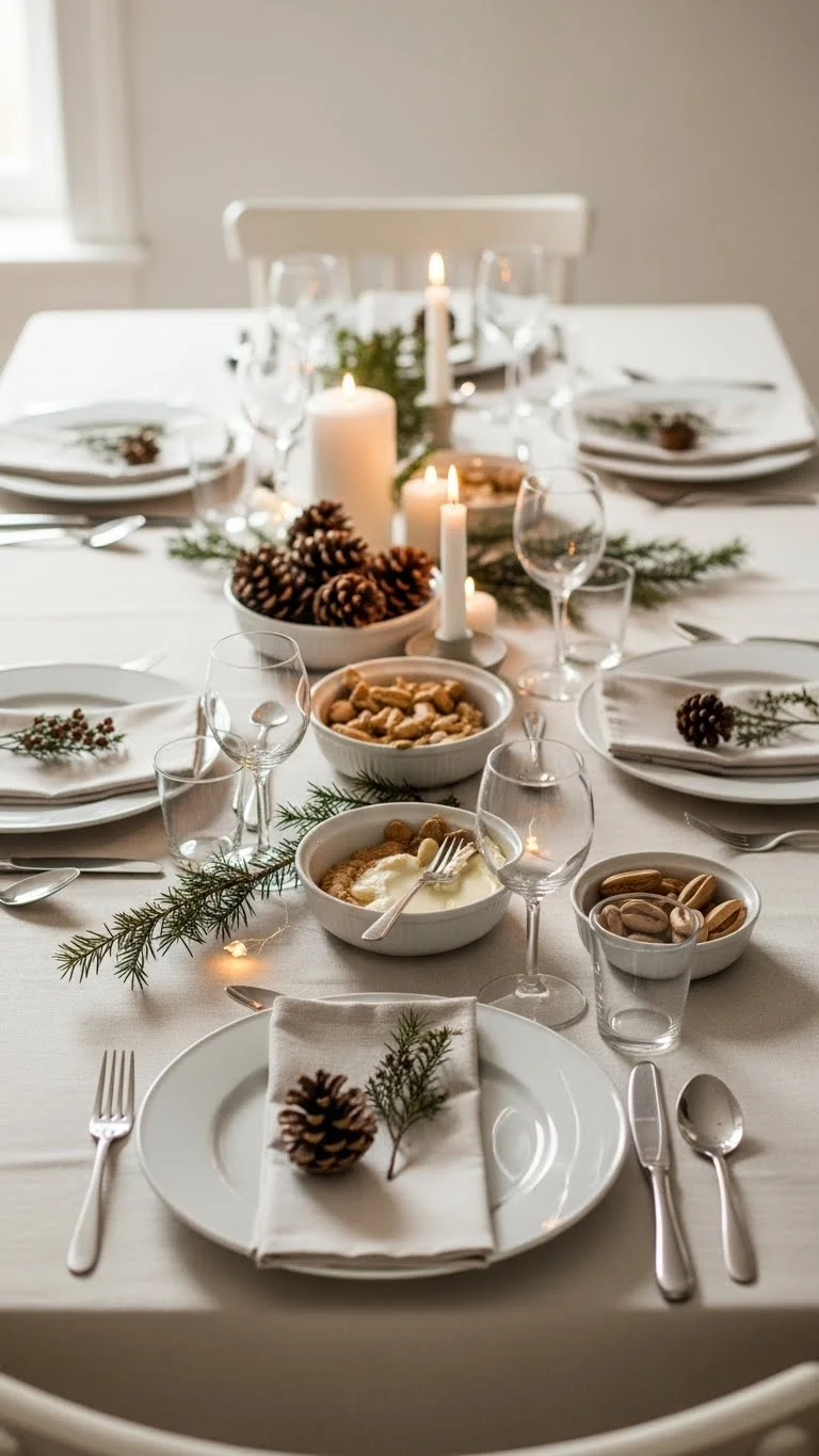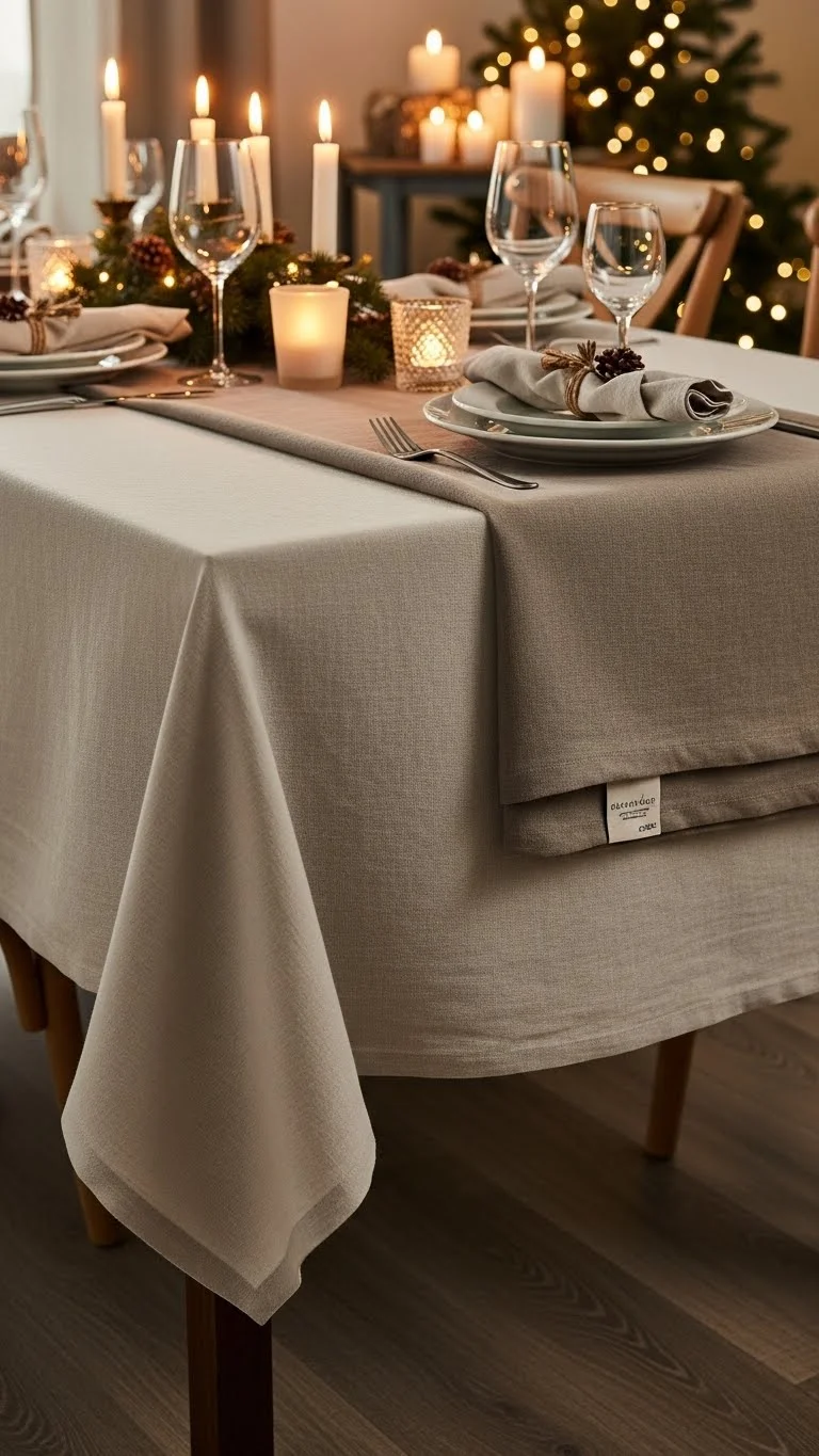 A tablecloth sets the base for everything else. Neutral colors work best. Think cream, beige, or soft gray. Texture adds interest without busy patterns. Linen, cotton, or even gauze works. If you do not own a holiday tablecloth, use a plain one. No holiday prints needed. Let the cloth drape naturally. Avoid stiff folds. Soft lines feel relaxed. If spills worry you, layer a runner on top. It protects the cloth and adds depth. For a budget option, buy fabric by the yard. Cut to fit. No sewing required if edges are hidden. Neutral tablecloths work year-round. That makes them a smart choice. They allow plates, candles, and greenery to stand out. A good base makes decorating easier. You add fewer items and still get a polished look.