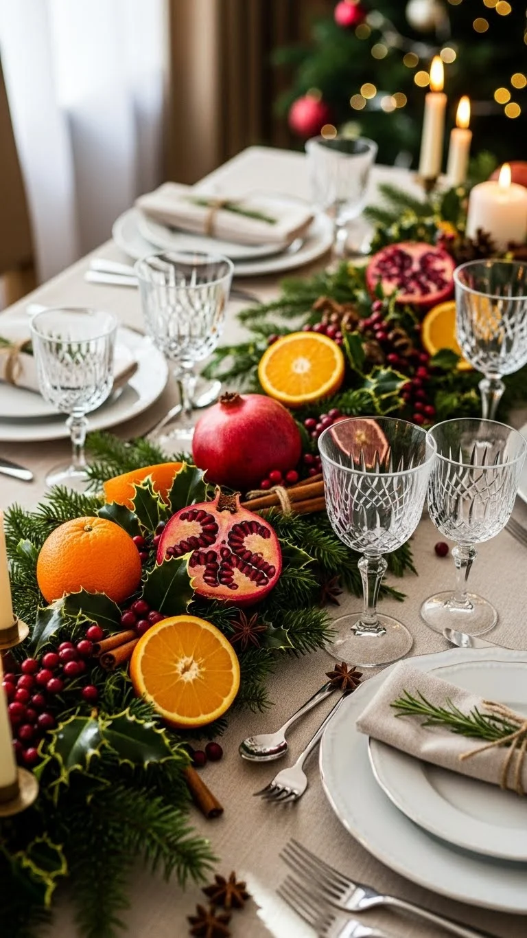 Seasonal fruit adds color and texture. Oranges, pears, and pomegranates work well. Place them in small bowls or directly on the table. They look good and smell nice. Fruit is affordable and easy to find. After the meal, use them in the kitchen. This avoids waste. Fruit pairs well with greenery. It adds life to the table. This idea feels generous and warm.