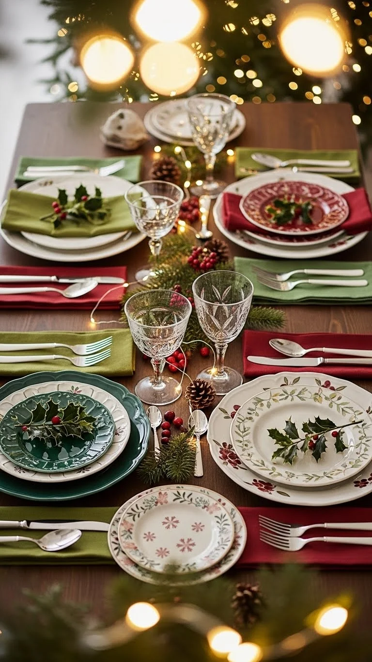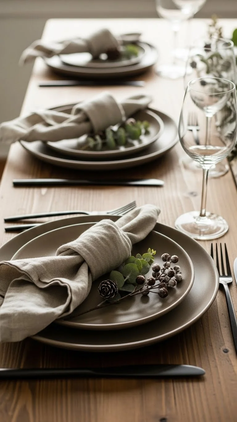 Perfect plate sets are not required. Mismatched plates feel personal and relaxed. The key is a shared color or tone. Choose one main color. White, cream, or soft gray works best. Mix patterns lightly. Avoid loud designs. Pull plates from different sets you already own. Borrow from friends if needed. Thrift stores are great for filling gaps. Keep plate sizes similar. This keeps the table balanced. Stack dinner plates with salad plates if you have them. If patterns feel busy, use plain chargers underneath. Even cardboard chargers wrapped in kraft paper can work. This style pairs well with simple napkins and glassware. Let the plates stand out. Guests often comment on mismatched tables. They feel warm and real. No pressure for perfection. This approach saves money. No shopping spree required. You use what you already have. Do matched plates work well for casual holiday meals? They feel inviting and lived-in, which helps guests relax right away.