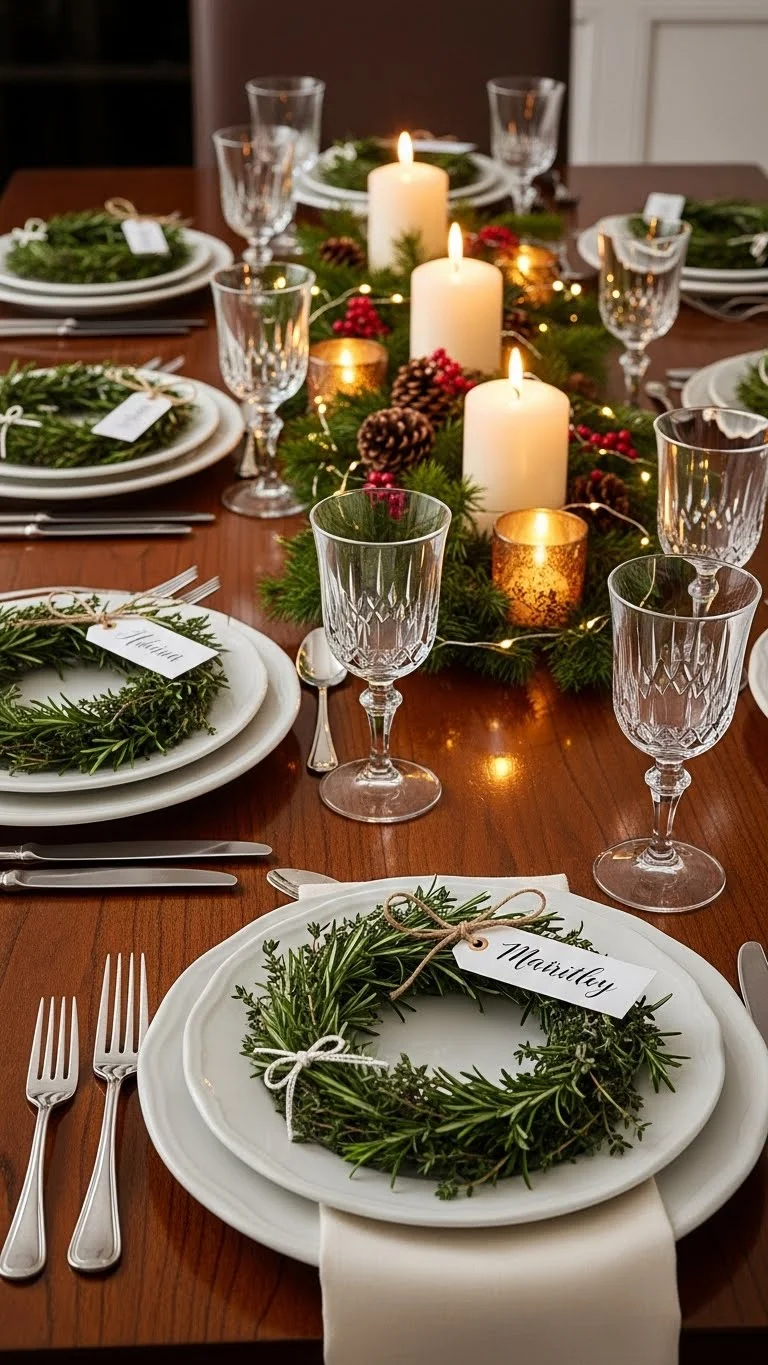 Mini wreaths pull double duty. They decorate the table and guide seating. They look special without much work. You can buy small wreaths or make your own. Floral wire and greenery scraps are enough. Shape small circles and secure. Tie a bit of twine around each wreath. You can’t wear a name tag if you like, but it is optional. Place wreaths on plates or napkins. Keep them flat so they do not tip. After dinner, guests can take them home. It becomes a small gift without extra cost. Faux greenery wreaths are a great option and store easily. Real ones add scent but dry out faster. Stick to simple designs. Avoid heavy ornaments. Greenery alone looks clean and seasonal. If time is short, use napkin rings shaped like wreaths. They give a similar effect. This idea works well for both small and large gatherings. It adds charm without crowding the table.