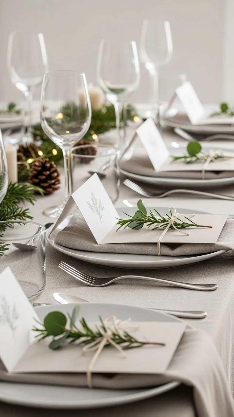 Place cards guide seating and add charm. They do not need to be fancy. Use plain cardstock in white, kraft, or soft colors. Fold into tent shapes. Write names with a black pen. If handwriting worries you, print names in a simple font. Cut and fold by hand. Add a small greenery sprig on top. Secure with tape underneath so it stays hidden. Skip glitter or heavy designs. Clean cards feel calm and clear. Place cards work well for larger gatherings. They remove awkward moments at the table. You can reuse cards by writing lightly in pencil. Or flip them over next year. This idea costs very little. Cardstock and pens are easy to find. Guests notice place cards. They show care and planning without fuss. This small detail helps the table feel complete and welcoming.