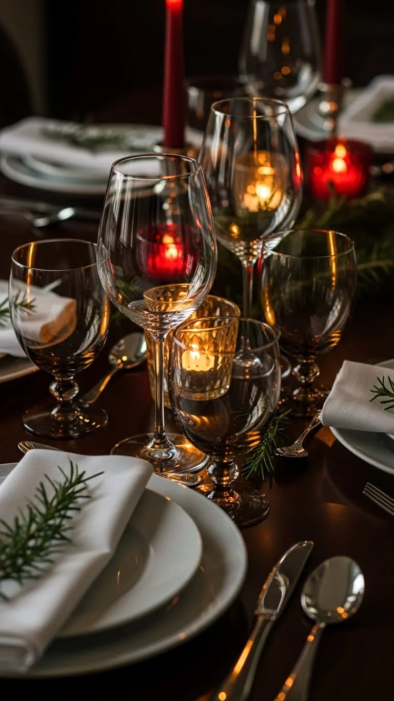 Glassware reflects candlelight beautifully. Clear glasses work well. Light tints add subtle interest. You do not need matching sets. Keep shapes similar if possible. Polish glasses before setting the table. Clean glass shines more in low light. If you own special glasses, this is the time to use them. Guests enjoy the change. Thrift stores often have unique glassware. A mixed set feels special. Avoid heavy colors that block light. Soft hues keep the table bright. Place glasses slightly above the plate. Keep spacing even. Glassware adds height without clutter. It keeps the table feeling open. This idea pairs well with candles and neutral linens. Guests notice sparkling glass. It adds a quiet sense of care to the table.