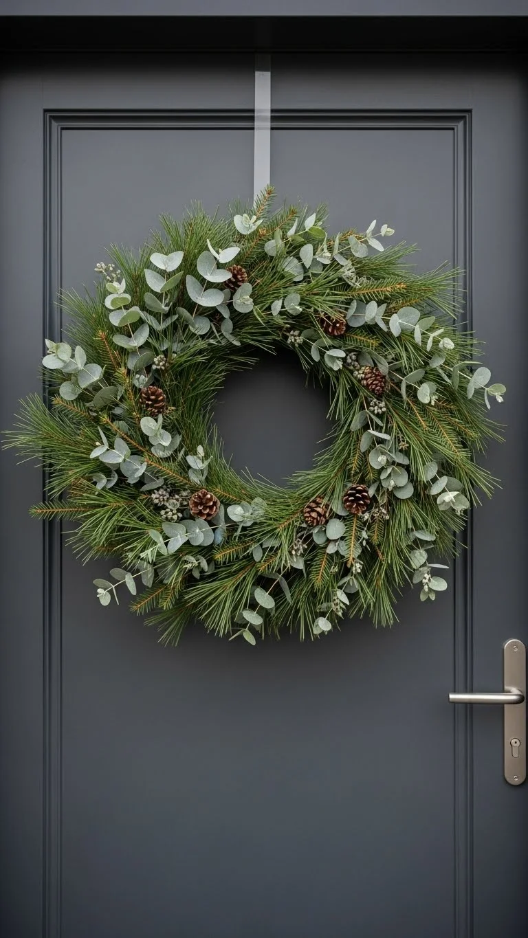 Create a wreath using fresh greens woven into a wire ring. Insert pinecones evenly around. Keep the design asymmetrical for a modern feel — fuller on one side. Spray lightly with water once in a while to slow drying. Use jute to hang instead of synthetic ribbon. This wreath works inside or outside. Add a linen bow if you like softness. Once dry, reuse the base next season and refill with new foliage.