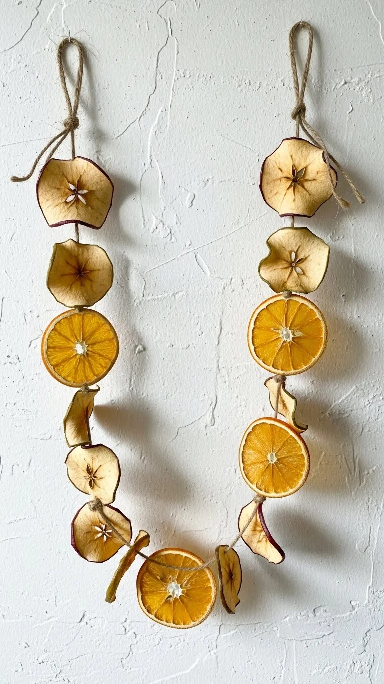 Dry apple slices along with oranges for variation. Thread them onto long twine. Place on windows or drape across shelves. Add bay leaves between slices for texture. This garland feels warm in the evening light. Store in a paper bag after January. Make different lengths to layer through hallways. Great sensory activity for kids.