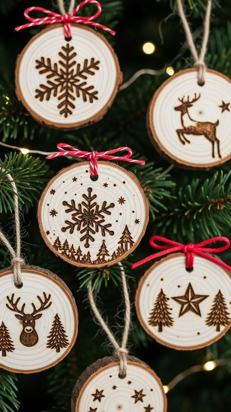 Cut fallen branches into thin slices or buy pre-cut discs. Drill a small hole. Draw simple stars or snowflakes with a pen or wood burner. Keep them unpainted for an earthy tone. Tie with a leather cord or twine. These ornaments last for years and look lovely with greenery-heavy trees. Add guest names for sentimental keepsakes.