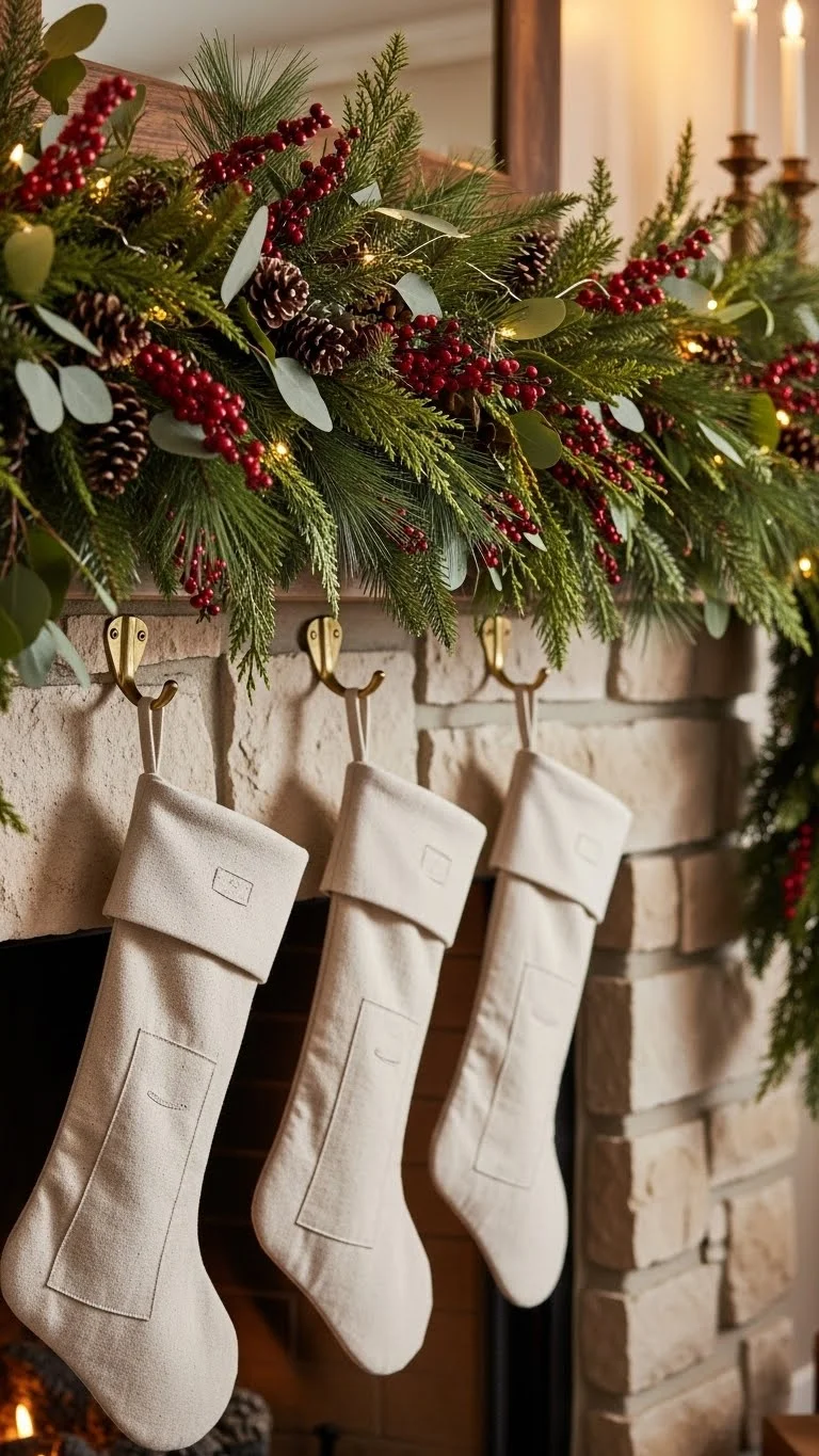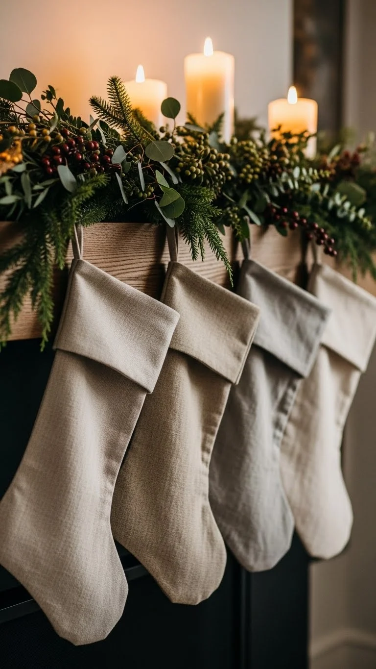 Sew or glue stockings using linen or cotton fabric scraps. Add simple wooden buttons. Keep colours beige, ivory, or grey for calm styling. Fill with treats or notes. These stockings pair well with greenery and wood accents. If sewing feels hard, use fabric glue. A timeless handmade element that lasts for years.