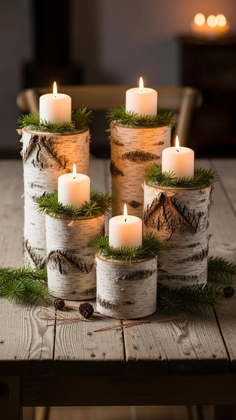 Cut birch logs into short sections. Drill spots for tea lights or place candles on top. Group 3–5 logs for variety in height. Set them on your dining table or entry console. Add moss for texture. Birch bark already looks decorative, so no extra work is needed. Keep logs indoors to dry before use. Beautiful for the winter months.
