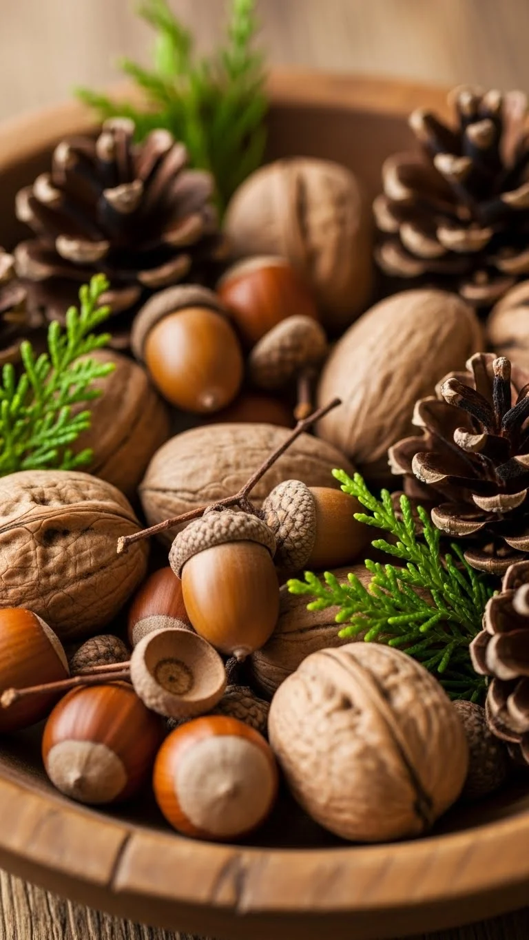 Fill a wooden or ceramic bowl with acorns, hazelnuts, walnuts, and pinecones. Tuck in small green branches for colour. Add unscented candles if desired. This natural mix feels warm and seasonal. You can gather acorns during fall walks. Refresh greenery when dry. Makes a quick last-minute centrepiece.