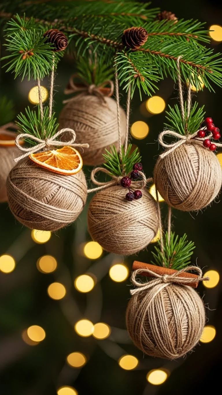 Wrap plain baubles with twine using glue. Keep the look matte and organic. Add a small wooden bead at the top. These fit natural and Scandinavian themes well. Make a set to match colour consistency. Cheap and beginner-friendly. Store in a box for reuse.