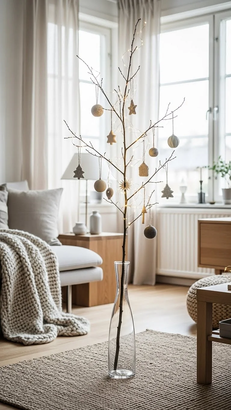 Place a large branch in a vase filled with rocks for support. Add minimal ornaments or dried fruit slices. Keep colours neutral for an airy look. A great choice for small spaces or offices. Add fairy lights for night glow. Change branches weekly if using fresh cuttings. Very low cost and visually calming.