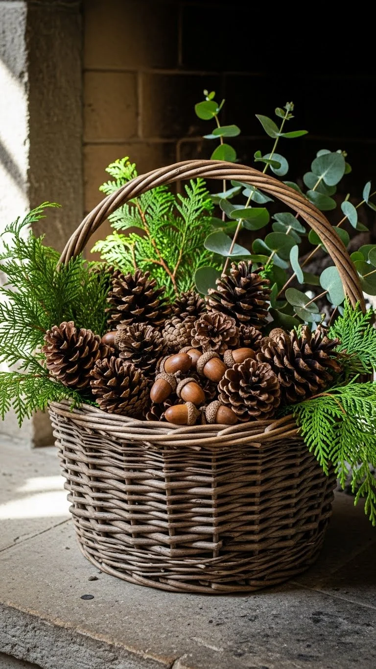Fill a woven basket with gathered pinecones. Add branches, cinnamon sticks, and dried leaves for depth. Place the basket near the fireplace or under a console table. It gives instant seasonal character with almost no effort. You can dry pinecones in the oven to remove moisture. Spray lightly with water and add a drop of vanilla for scent. If you prefer a snow-touch look, brush tips with white paint. This project uses items from nature, keeping costs near zero. Rotate in new foliage weekly to keep it looking alive. Try adding a few small ornaments for a subtle sparkle without going overboard. A basket display makes corners feel intentional and styled.