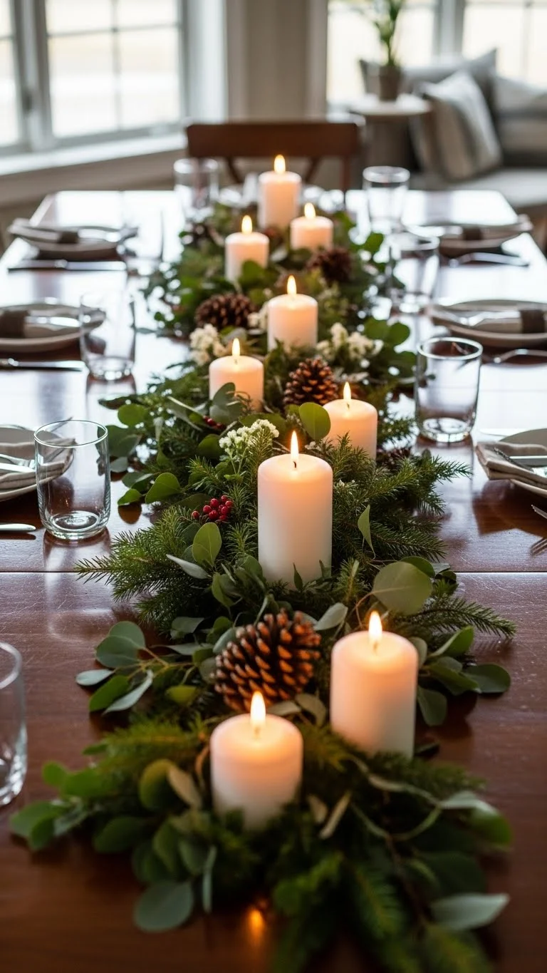 Lay branches directly down the centre of your table instead of using fabric. Add unscented candles, walnuts, wooden beads, and apples for interest. This creates a soft forest table scene. Mix evergreen types for layers — fir, cedar, pine. Use small branches for narrow tables and thicker pieces for large dinners. Replace dry foliage weekly. Keep candles in glass holders for safety. Scatter salt lightly for a snowy touch. A greenery runner pairs well with neutral linen napkins and wooden chargers. This setup works for meals, gatherings, or everyday decor. Costs remain low when branches are sourced outdoors or from trimming piles.