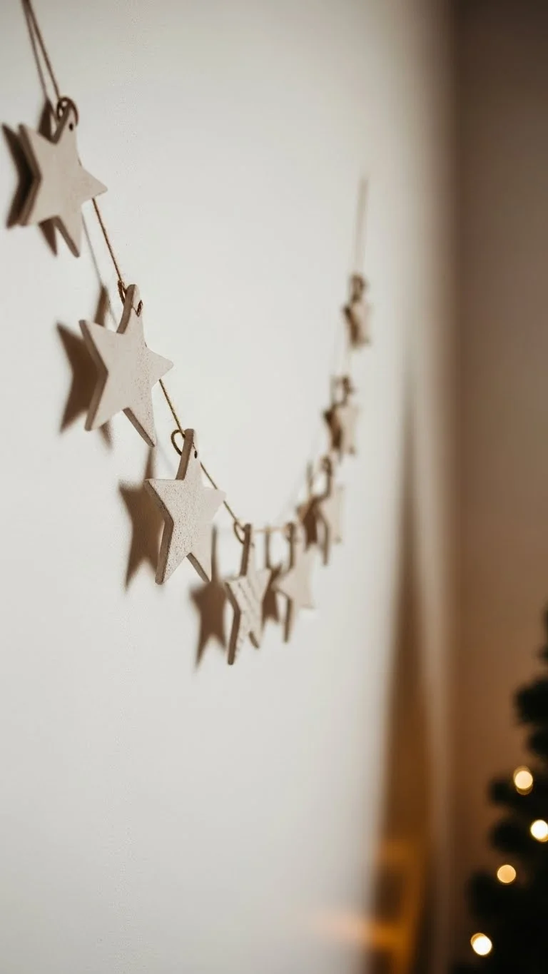 Roll air-dry clay and cut star shapes. Punch holes at the top and thread twine. Add light texture with a leaf imprint or linen cloth press. Leave plain white for a clean look or brush with matte gold. Hang the garland on mantels, mirrors, or kids’ rooms. Clay stars last for years when stored carefully. You can make mini versions for ornaments or gift tags. This craft keeps styling minimal while still festive. A quiet decor piece that suits modern or farmhouse interiors. Kids can help cut shapes, making it a family moment.
