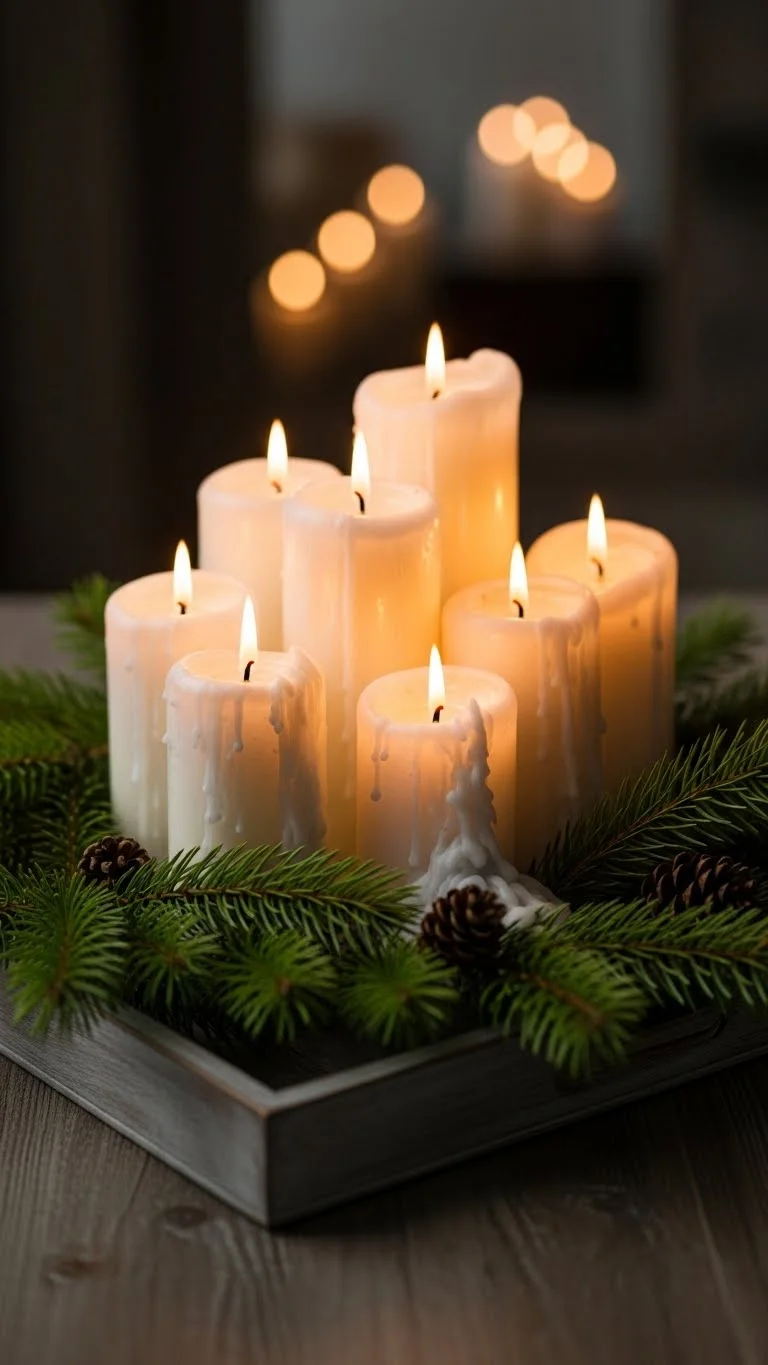 Place white candles on a tray. Surround them with small pine branches or cedar tips. Add a few pinecones for texture. This arrangement works for coffee tables, entry stands, or bedside corners. Keep candles unscented when using fresh foliage so the scent doesn’t clash. Use varying candle heights for a layered glow. Rotate branches when they dry. You can add ribbon strips or dried berries for colour. This idea feels calm and earthy without loud decor. Very low cost and quick to prepare.