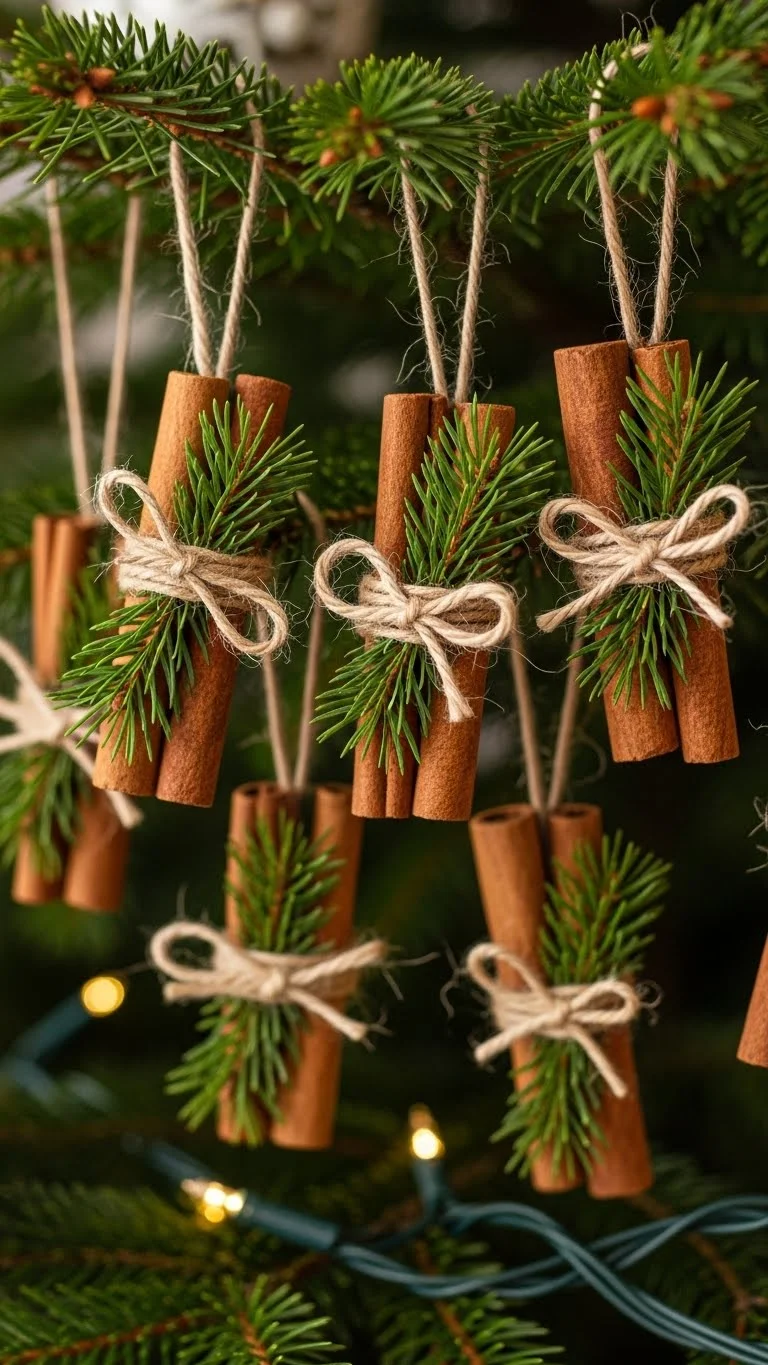 Tie 3-5 cinnamon sticks together with twine. Glue a tiny pine sprig on top. Hang on the tree or tuck into a wreath. These scent the room gently without sprays. Make 10-15 bundles to spread across branches for cohesion. You can buy cinnamon in bulk for cheap. Add small beads or bells if you enjoy sound. Natural style, quick execution.