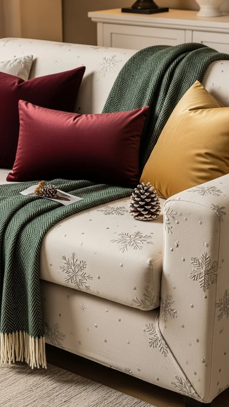 Swap everyday pillows for softer, warmer ones. Use faux fur, chunky knit, or flannel covers. Mix patterns like snowflakes, plaids, and simple solids. If you don’t want to buy new pillows, just buy covers—more affordable and easy to store. Add two large pillows on each side of the sofa and a smaller one in the center. This creates comfort without taking up too much space.