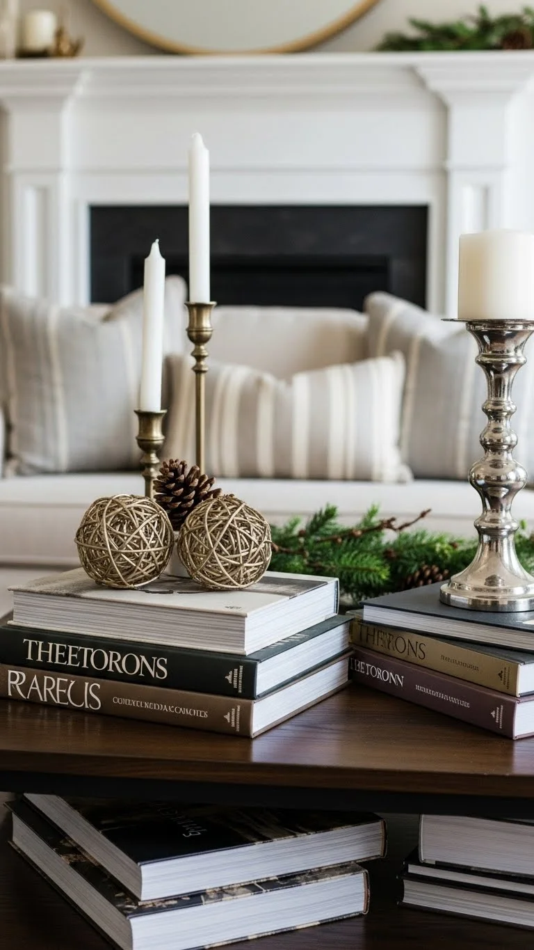 Stack a few books on your coffee table. Place a small ornament or pine sprig on top. Use neutral or red book covers for a seasonal feel. This adds height and interest without extra shopping. You can mix old novels and magazines for a relaxed look.