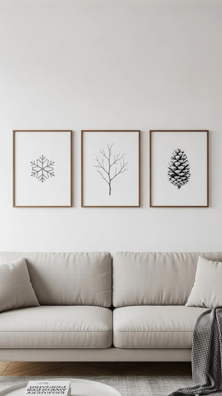 Swap everyday art for simple winter prints. Use free printable designs or paint your own minimal shapes. Frame them using existing frames. Choose calm colors like white, green, or soft red. This gives your living room a seasonal update without spending much. You can swap the prints back after the holidays.
