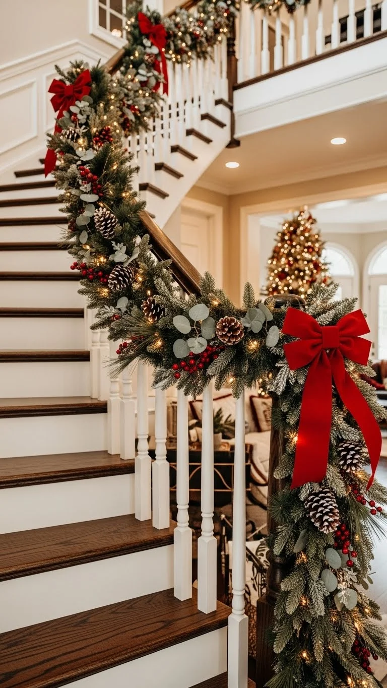If your living room connects to a staircase, decorate the rails. Wrap garland around them. Add ribbon or lights. This pulls the whole room together and extends the décor beyond the main area. Use lightweight garlands so they’re easy to attach. It adds charm without much work.