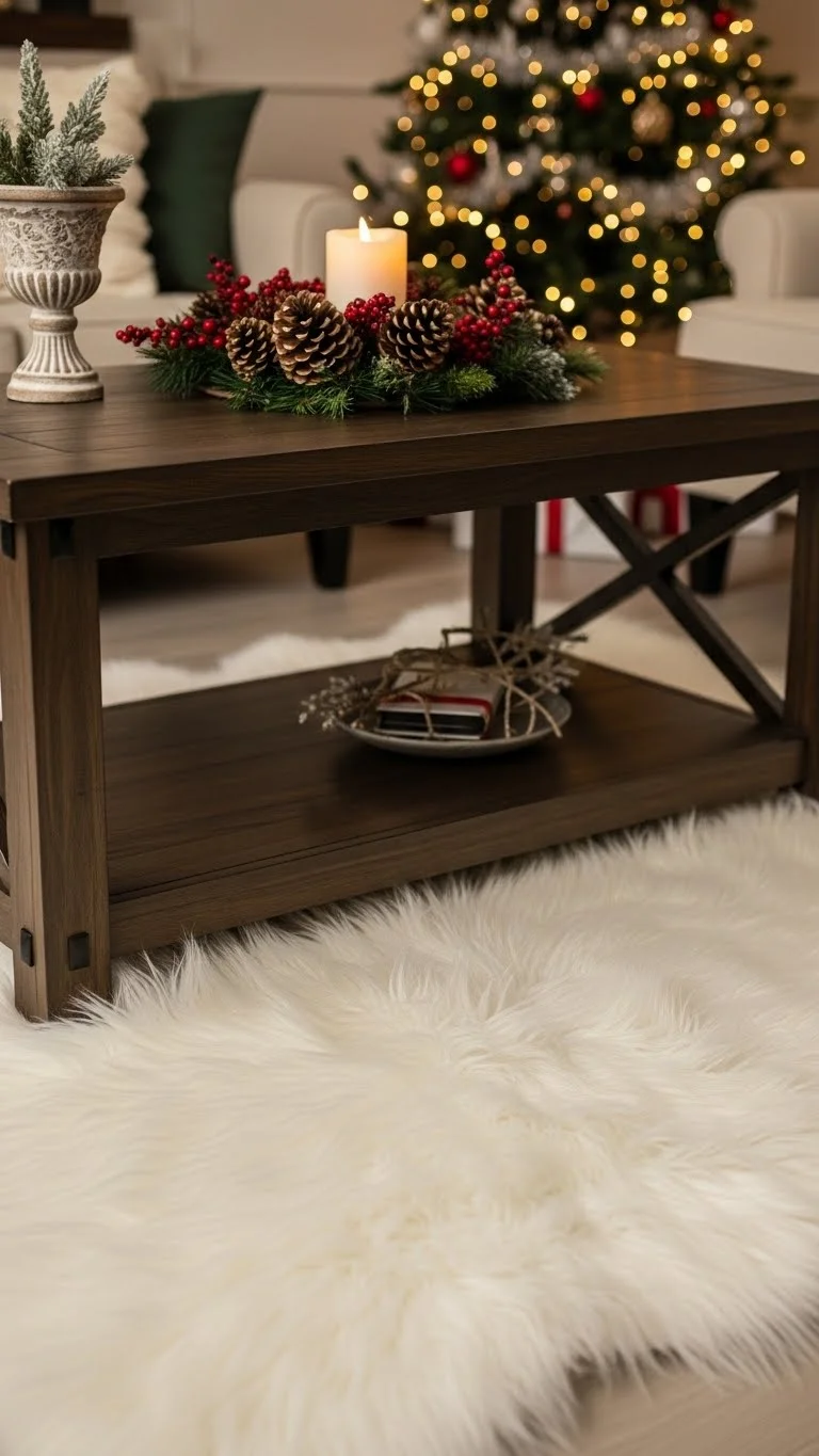 A small faux fur rug adds comfort instantly. Place it under the coffee table or near the fireplace. Choose white or cream for a winter feel. Look for discount options to save money. You can even use a faux fur throw as a rug if you need something temporary. This adds softness and warmth without much effort.