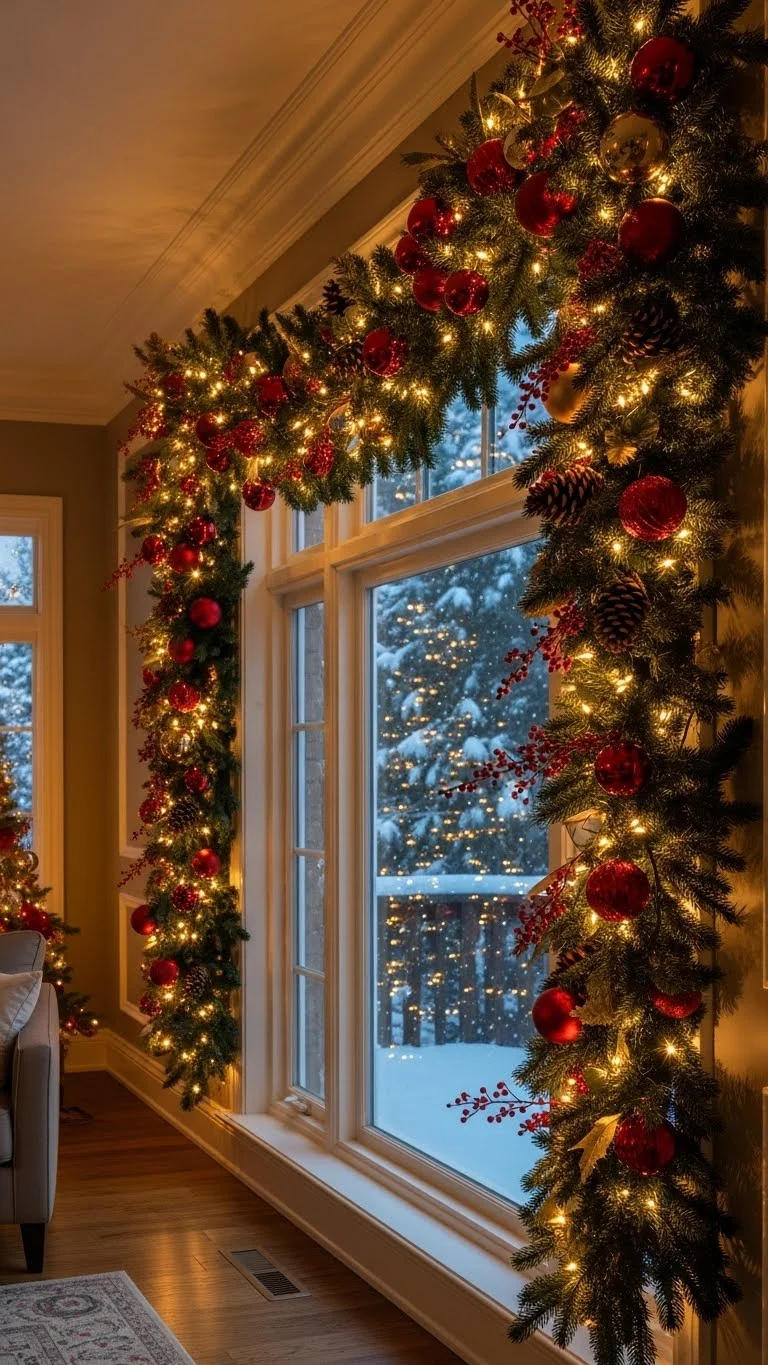 Decorating around windows adds charm. Use a lightweight garland. Hang it around the frame with small hooks or clear tape. Add simple ornaments or ribbon pieces if you want more color. Keep the window open to natural light so the greenery stands out. This is a low-cost way to fill empty wall space and add softness to the room.