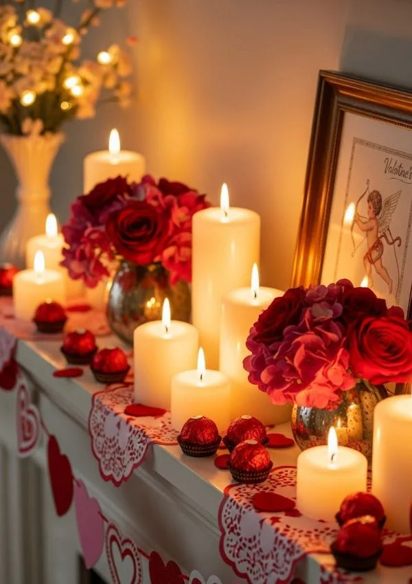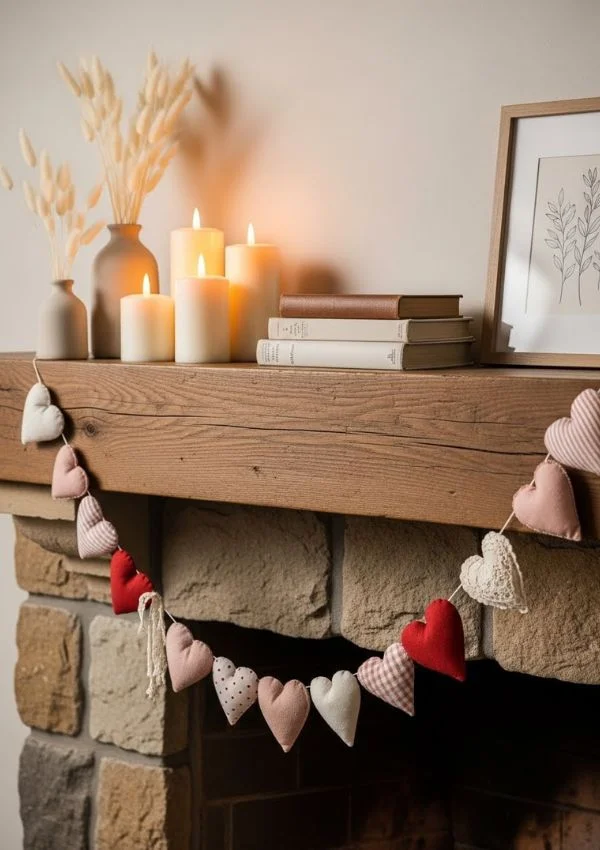 Nothing says romance like warm lighting. Candles instantly elevate your Valentine’s mantel, even if everything else is simple.