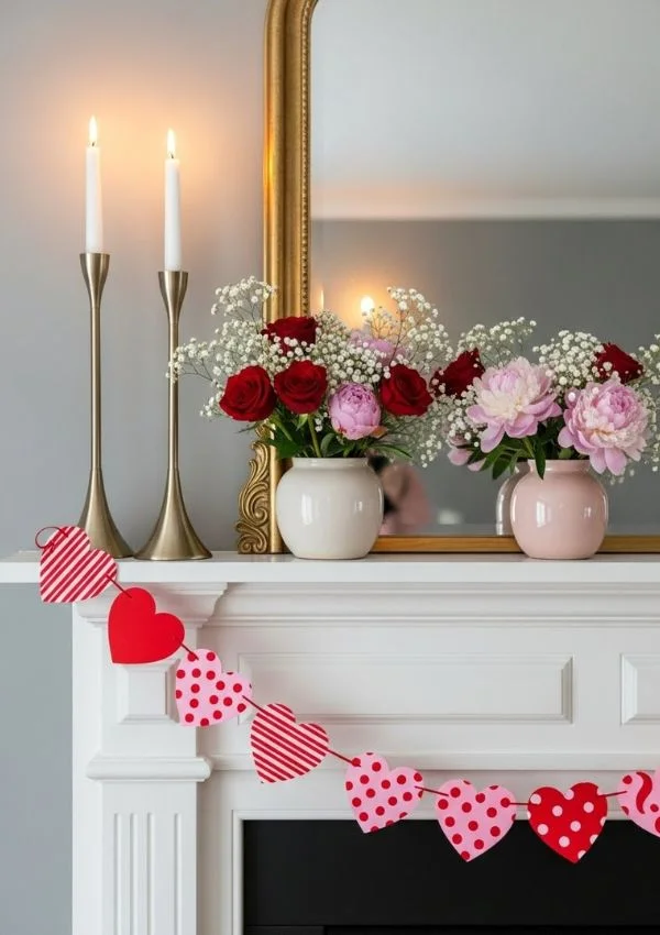 Garlands are one of the easiest and cheapest ways to decorate a mantel for Valentine’s Day.