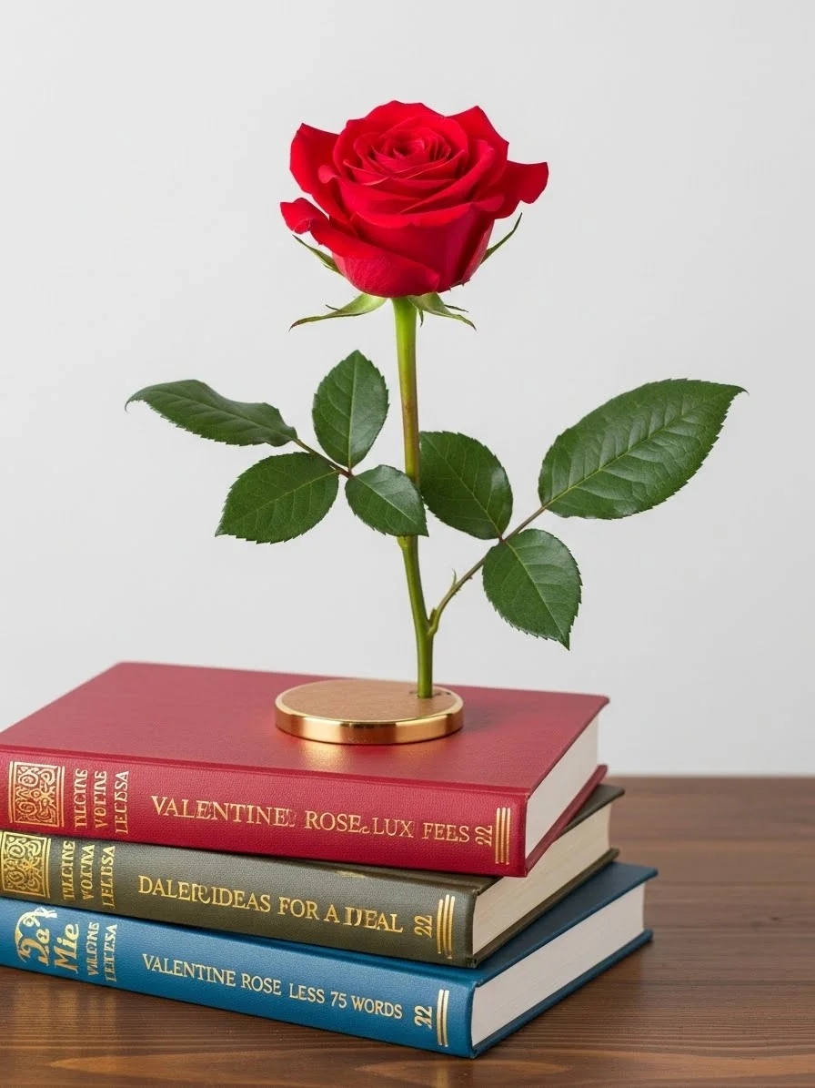 Stack two or three neutral books and place a rose on top. Use a small dish or bud vase. This setup works well on nightstands or consoles. Keep covers muted. Everyday items feel styled when paired with one thoughtful flower.