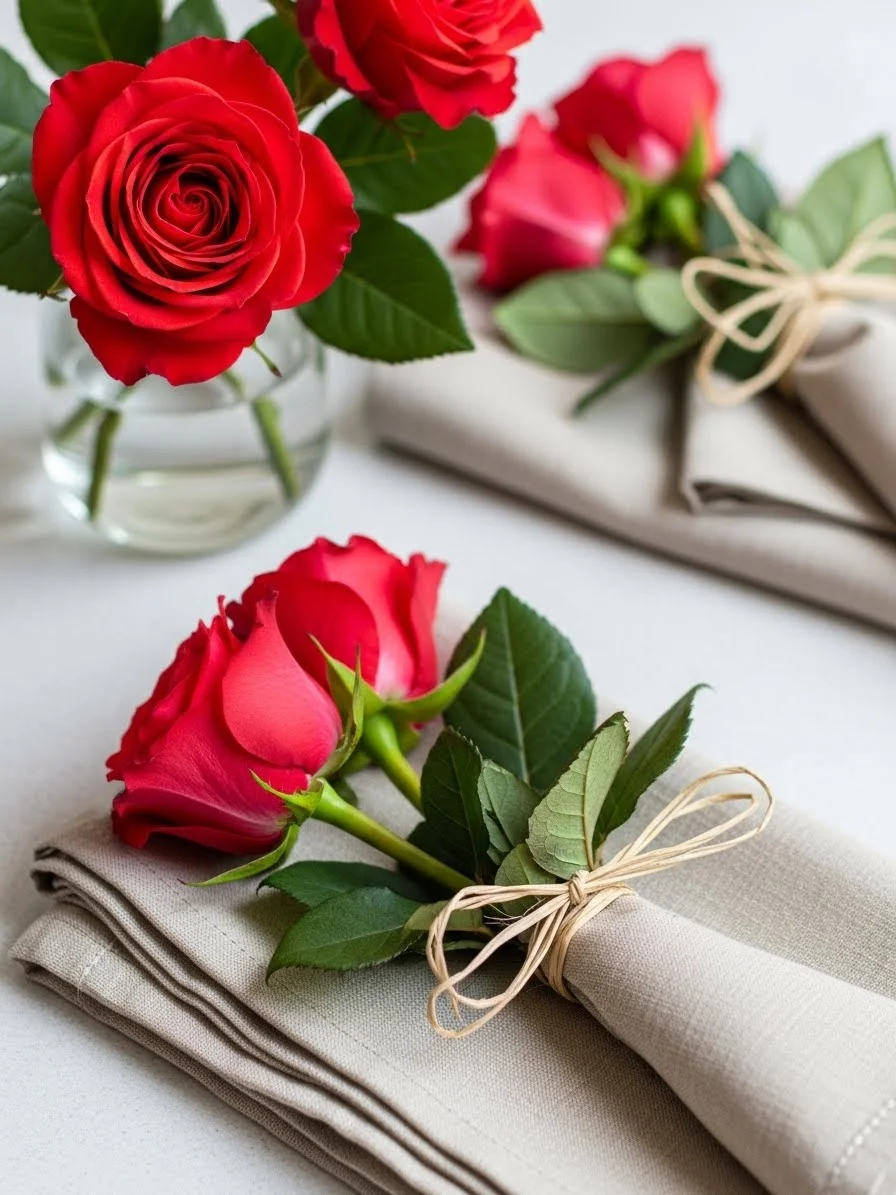 Fold linen napkins and place a single rose on top at each place setting. Keep colors neutral. This works for dinners or casual meals. Faux roses avoid wilting. Simple placement adds grace without extra cost.