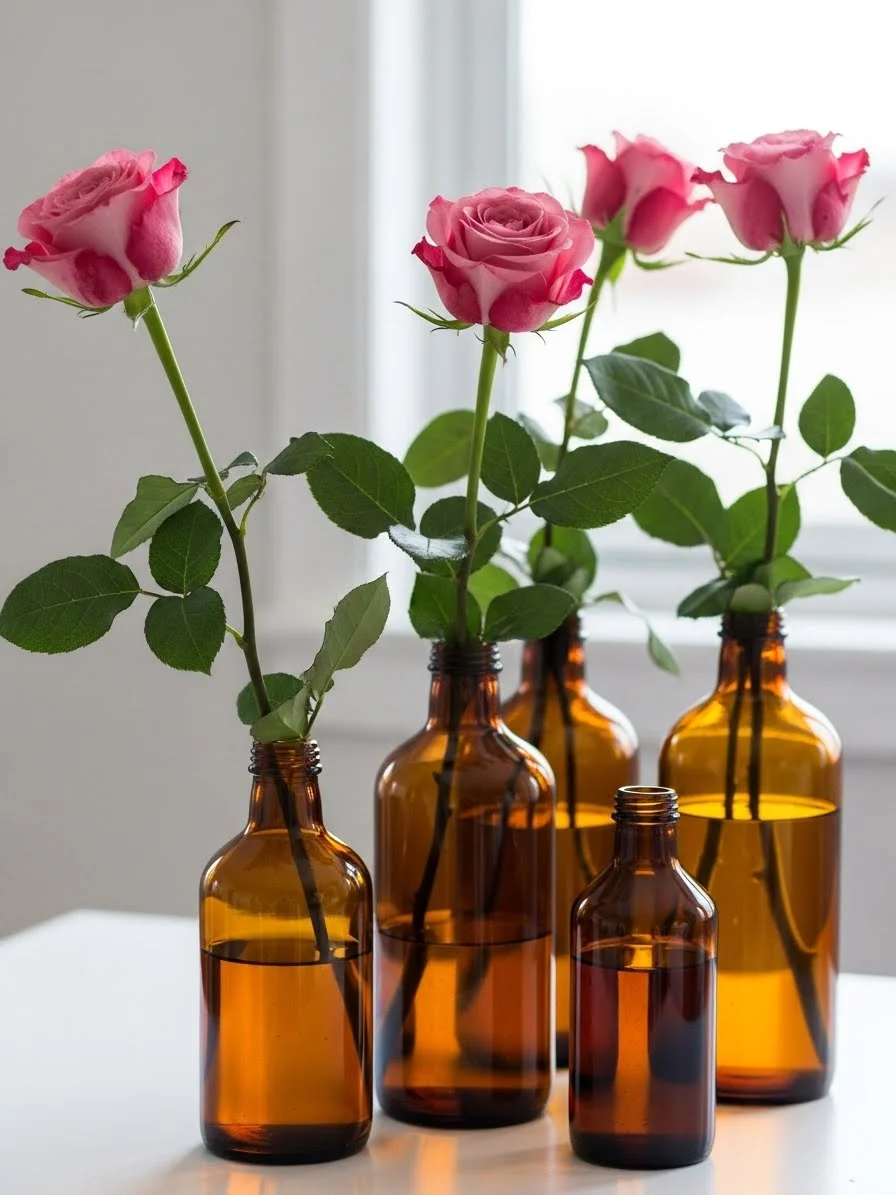 Amber bottles soften rose colors. Use one stem per bottle. Group three bottles loosely on a shelf or table. Thrifted bottles keep spending low. Warm glass tones add depth without bold color.