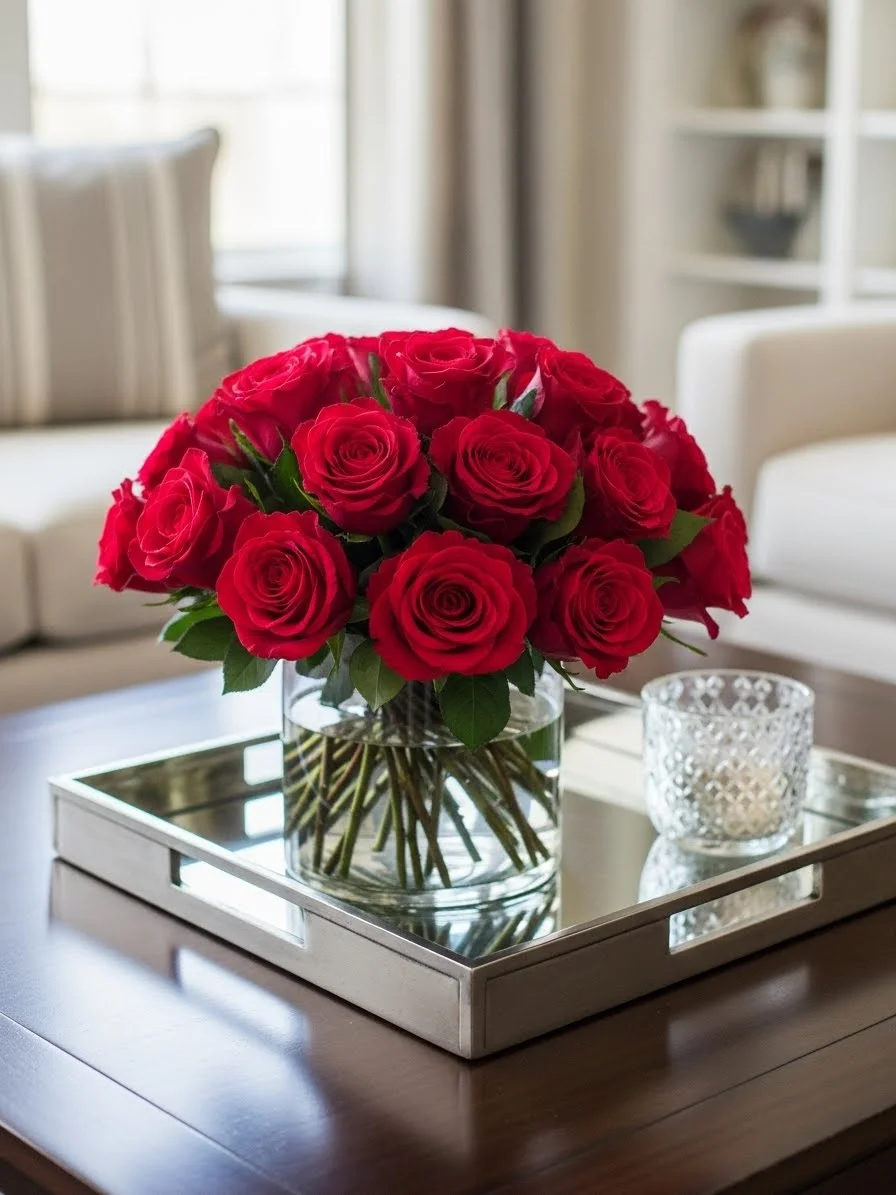 Place a small rose arrangement on a tray with one candle or a book. Keep the tray neutral. Use short stems so the roses sit low. This keeps the table usable. Faux blooms work well for daily living. Low profiles keep the balance and prevent the setup from feeling formal.