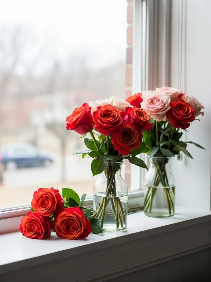 A window ledge offers natural light that flatters roses. Place two or three small vases spaced evenly along the ledge. Use one stem per vase. Keep colors soft so sunlight does the work. Clear or frosted glass keeps the look light. Faux roses work well if the ledge gets warm. Even spacing feels calm and avoids a crowded look while still drawing attention.