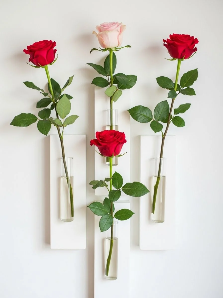 Wall vases turn roses into quiet art. Use clear or ceramic wall holders. Place one stem per vase. Arrange them in a loose vertical line. This works well in hallways or near mirrors. Faux stems are practical here. One stem per vase keeps the balance and avoids visual noise.